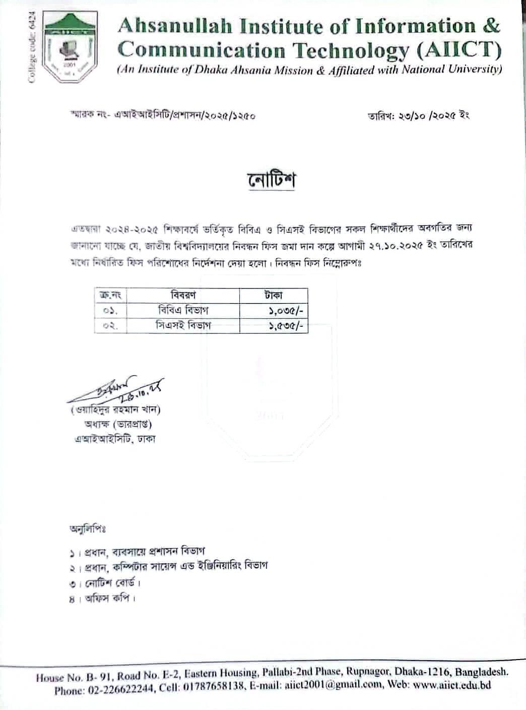 সিএসই ও বিবিএ ২০২৪-২৫ শিক্ষাবর্ষের শিক্ষার্থীদের জাতীয় বিশ্ববিদ্যালয়ের নিবন্ধন ফিস জমাদানের নোটিশ